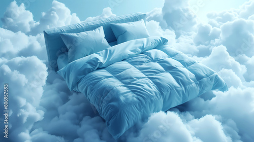 A serene and inviting blue bed set floating among fluffy clouds under a sky-blue backdrop.