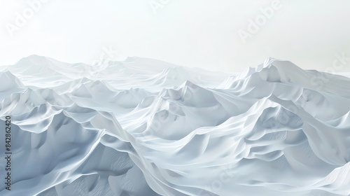 A serene and minimalistic white mountain landscape with smooth hills and valleys white background.