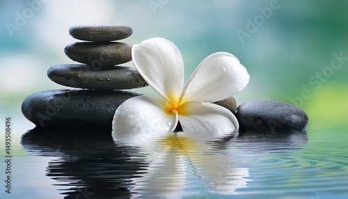 a serene and peaceful scene of stacked stones and a white flower in the water