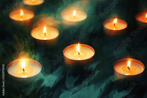 A serene arrangement of floating candles creating a warm ambiance on dark water. Ideal for themes of meditation, tranquility, and romance, this image evokes calm feelings.