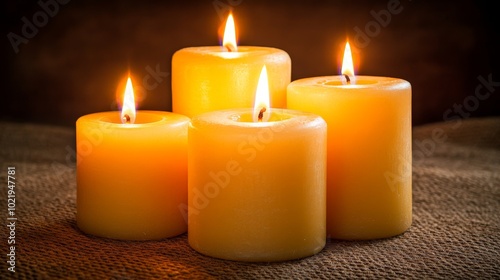 A serene arrangement of four lit candles, creating a warm and calming atmosphere.