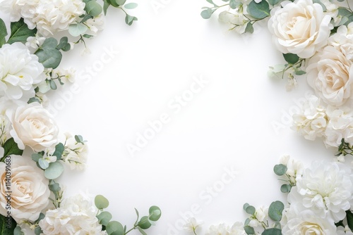 A serene arrangement of white flowers and greenery frames a blank white space, perfect for invitations, cards, or announcements.