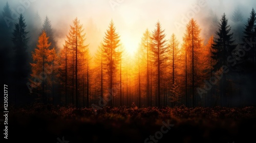 A serene autumn forest is bathed in golden light as the sun sets, creating a magical atmosphere with vibrant orange and rich black tree silhouettes.