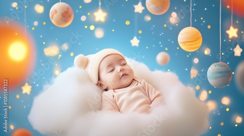 A serene baby peacefully sleeping on a soft cloud, surrounded by colorful planets and twinkling stars in a dreamy setting.