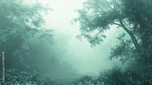 A serene background image of a foggy morning in a lush forest.