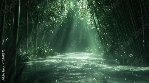 A serene bamboo forest with a flowing river illuminated by soft sunlight.