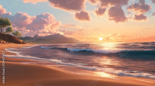 A serene beach at sunset with soft waves washing over the shore and the sky ablaze with color
