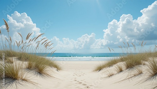 A serene beach scene featuring tall grasses on sand dunes, leading to a tranquil ocean under a bright blue sky with fluffy white clouds. Perfect for relaxation and escape.