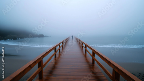 A serene beach scene with a wooden pier and a person walking on it. The foggy atmosphere adds a sense of tranquility to the scene, as the misty air envelops the pier and the beach