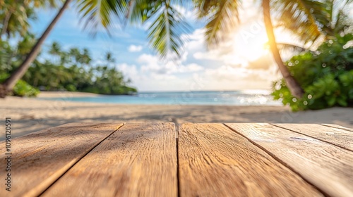 A serene beach scene with palm trees, golden sunlight reflecting on the water, and a wooden surface in the foreground, creating a tropical paradise atmosphere.