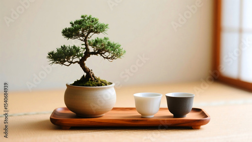 A serene bonsai tree graces a wooden tray, accompanied by two small ceramic cups, creating a tranquil scene