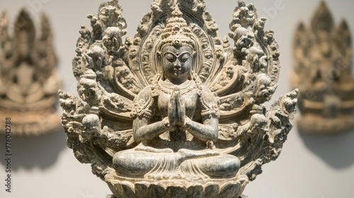 A serene Buddha statue sits in meditation, surrounded by a detailed bronze halo, set against a textured teal and gold background.