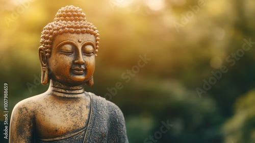 A serene Buddha statue surrounded by soft sunlight, representing peace, harmony, and spirituality in a natural setting.