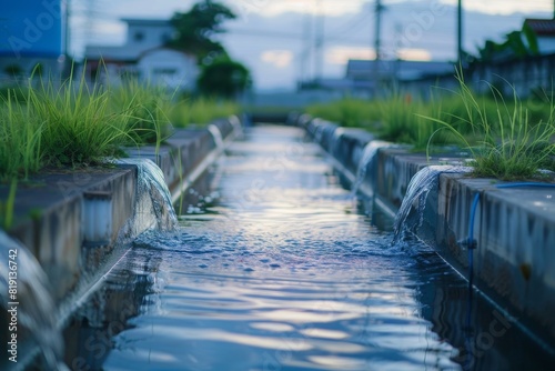 A serene canal with flowing water surrounded by grass, captured at dusk with a soft blue and green palette.