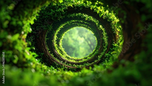 A serene, circular pathway of lush greenery creates a tranquil atmosphere, inviting exploration and connection with nature