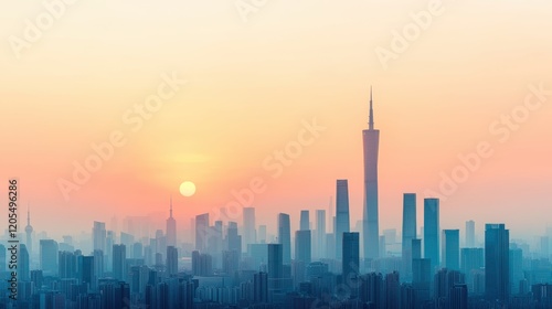 A serene city skyline at sunset, featuring towering skyscrapers silhouetted against a colorful sky.