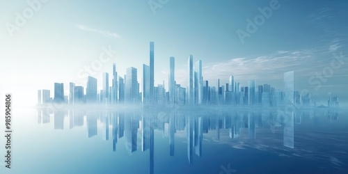 A serene city skyline reflecting on calm waters, showcasing modern architecture under a clear blue sky.