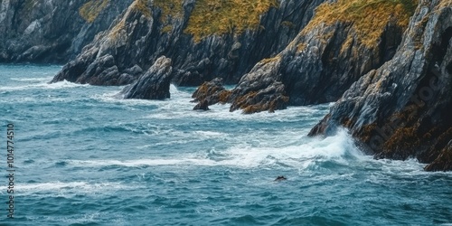 A serene coastal scene featuring rugged cliffs and gentle waves lapping against the shore, evoking a sense of tranquility.