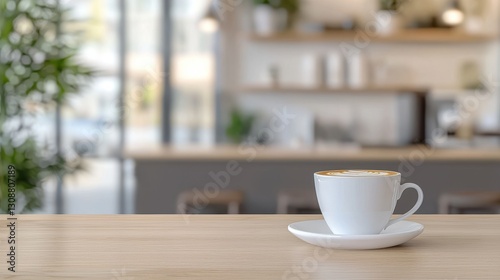 A serene coffee cup on a wooden counter in a bright, modern cafe setting, capturing a cozy and inviting atmosphere.