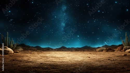 A serene desert landscape at night, with cacti framing a view under a starry sky and distant rolling hills, creating a tranquil and expansive atmosphere.