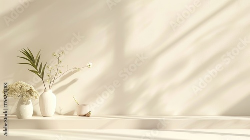 A serene display of minimalistic vases and plants casting soft shadows on a light wall.