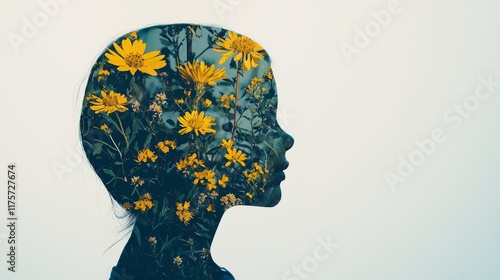 A serene double exposure image featuring a silhouette of a child filled with vibrant yellow flowers against a soft background.
