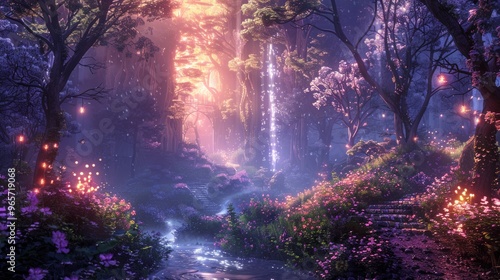 A serene enchanted forest at twilight with glowing flowers and a gentle stream flowing through vibrant flora