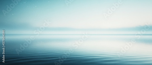 A serene expanse of calm water stretches into the horizon, blending seamlessly with the soft, misty sky in hues of blue.