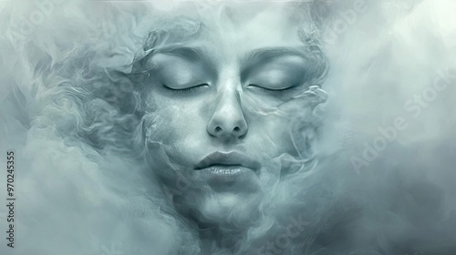 A serene face emerges from soft wisps of fog, creating an ethereal atmosphere that evokes tranquility and introspection.