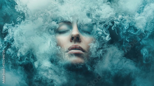 A serene face emerges from swirling clouds of mist, evoking peace and introspection.