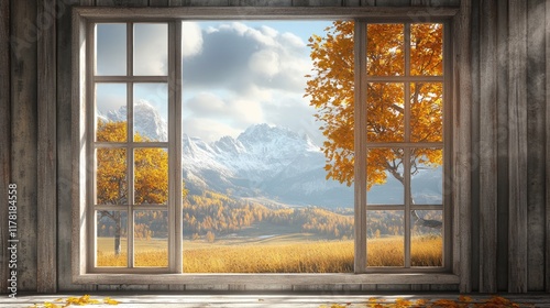 A serene fall landscape of golden leaves and distant peaks seen through a large window in a rustic home.