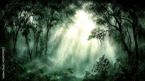 A serene, foggy forest with soft rays of sunlight filtering through the mist, casting a warm, ethereal light across the trees and creating a calm, mysterious mood