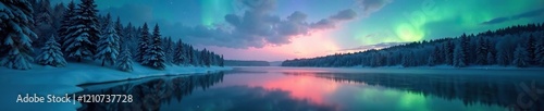 A serene forest lake under the soft glow of aurora borealis at dawn, forest lake, morning light, frozen scenery