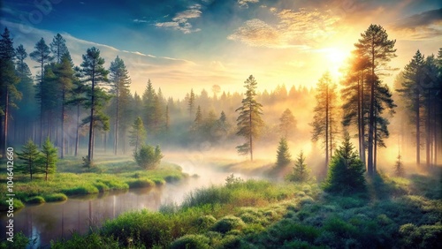 A serene forest landscape with misty dawn atmosphere and soft, filtered light, atmospheric perspective, mist, outdoors, sunlight filtering