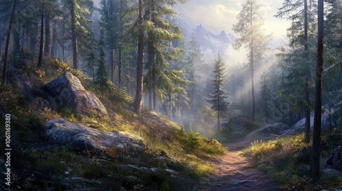 A serene forest landscape with sunlight filtering through trees and rocky terrain.