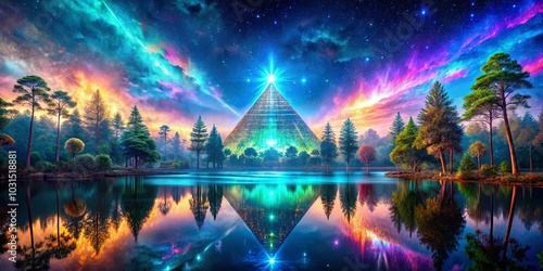A Serene Forest Oasis with a Glowing Pyramid Reflecting in a Still Lake Under a Starry Sky