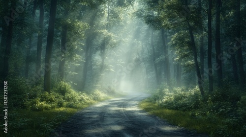 A serene forest path illuminated by soft sunlight filtering through the trees, creating a tranquil and enchanting atmosphere.