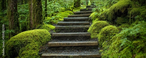 A serene forest path leads through lush greenery, with moss-covered steps inviting exploration in a tranquil natural setting.