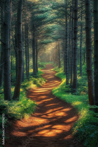 A serene forest path, lined with tall, dense pine trees, bathed in soft, diffused morning light