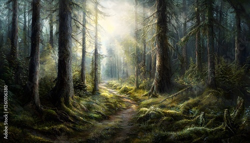 A serene forest path with sunlight filtering through tall trees, creating a dappled light effect on the mossy ground and dense greenery