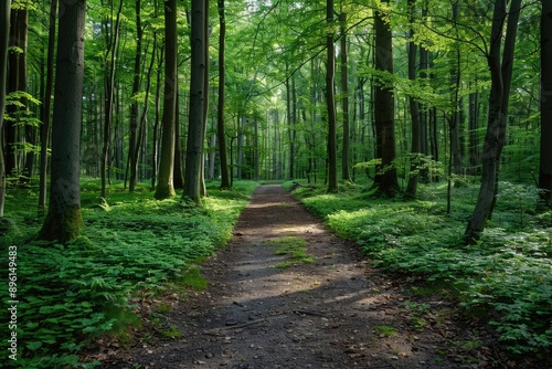 A serene forest pathway surrounded by lush green trees, inviting exploration and offering tranquility in nature's embrace.