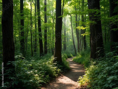 a serene forest pathway winding through tall lush trees with sunlight filtering through the leaves