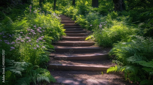 A serene forest pathway with stone steps surrounded by lush greenery and blooming flowers.