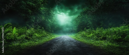 A serene forest road surrounded by lush greenery and mysterious fog.