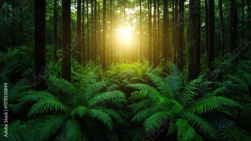 A serene forest scene featuring lush ferns and sunlight filtering through tall trees, creating a tranquil and vibrant atmosphere.