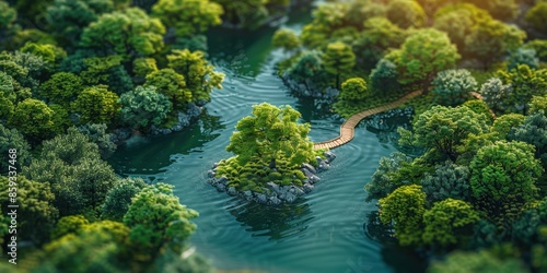 A Serene Forest Scene with a Winding Stream and a Wooden Bridge