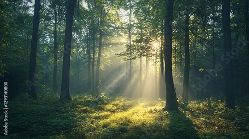 A serene forest scene with sunlight streaming through the trees, illuminating the lush greenery on the forest floor.