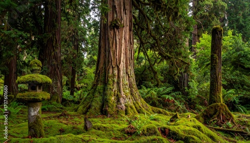 A serene forest scene with towering trees, moss-covered ground, and stone structures, bathed in soft, diffused light
