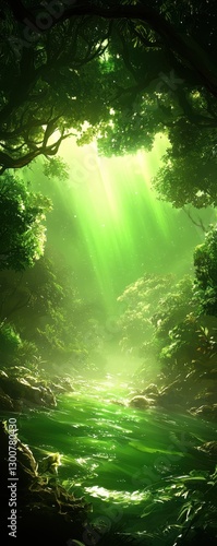 A serene forest scene with vibrant green foliage, illuminated by gentle sunlight filtering through the trees, creating a tranquil atmosphere near a reflective stream.