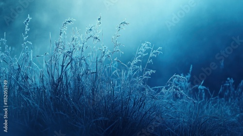 A serene, frosty landscape featuring delicate grasses illuminated in soft blue tones.